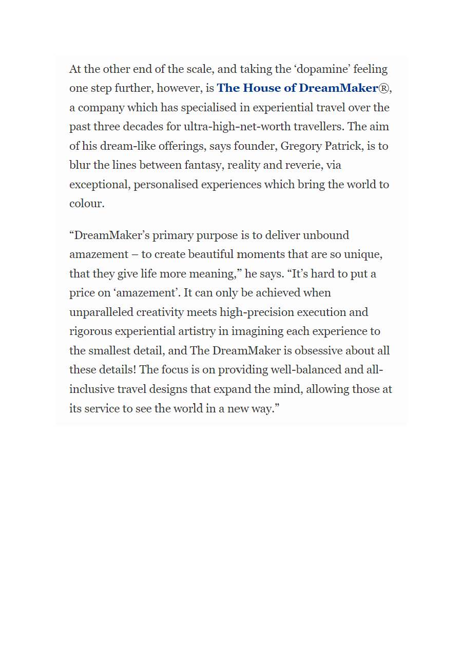 At the other end of the scale, and taking the ‘dopamine’ feeling one step further, however, is The House of DreamMaker®, a company which has specialised in experiential travel over the past three decades for ultra-high-net-worth travellers. The aim of his dream-like offerings, says founder, Gregory Patrick, is to blur the lines between fantasy, reality and reverie, via exceptional, personalised experiences which bring the world to colour.
